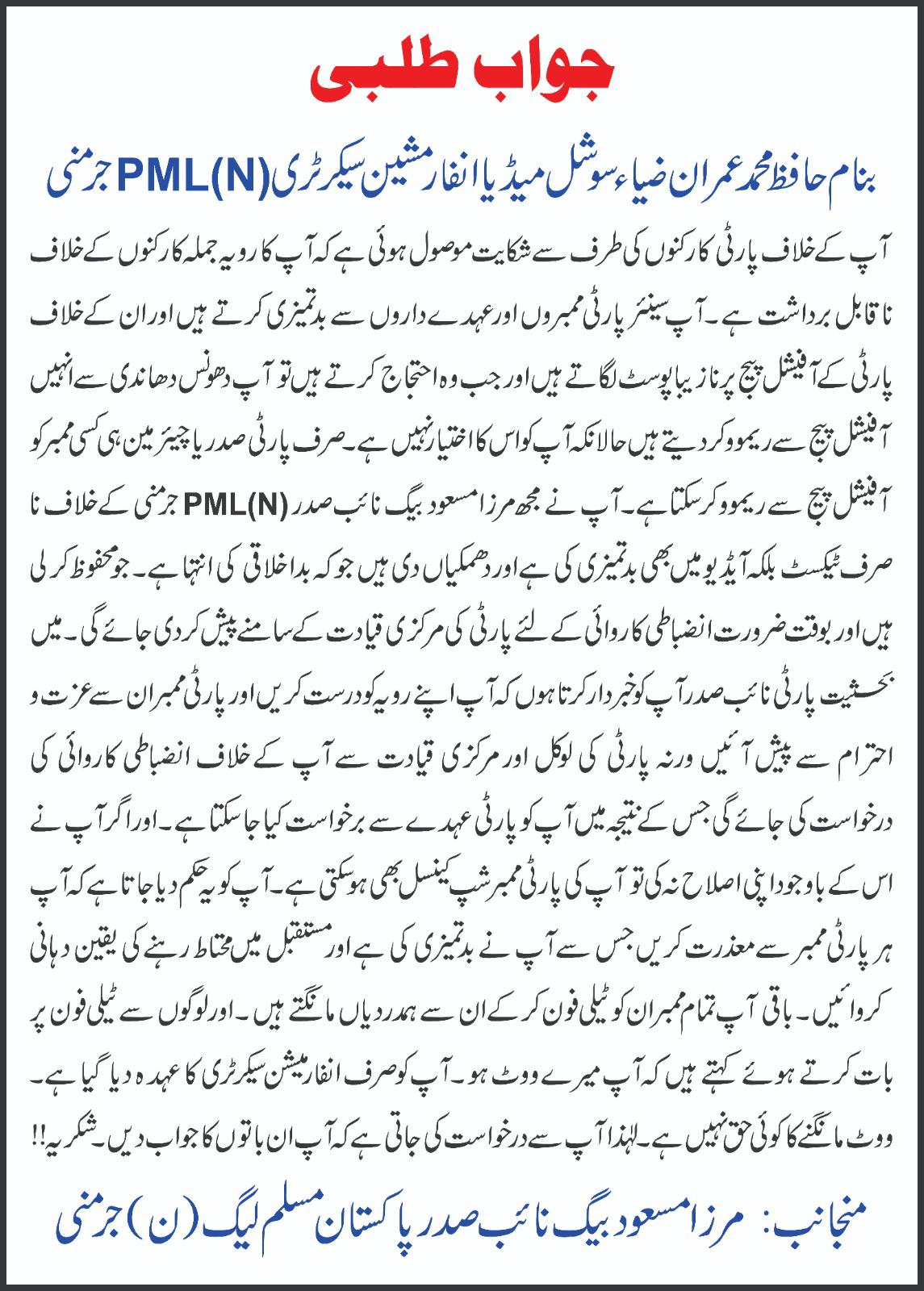 مسلم لیگ نون جرمنی اختلافات کا شکار-گروپ بندیاں ہو رہی ہیں- لوکل قیادت جلد ایکشن لے-